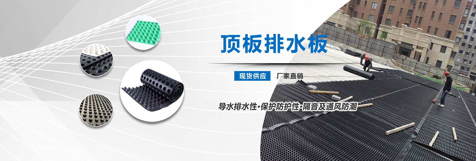 排水板是由聚苯乙烯(HIPS)或者是聚乙烯(HDPE)塑膠底板經(jīng)過沖壓制成圓錐突臺或者加勁肋的凸點(或中空圓柱形多孔)而成,幅寬有3米,長度有10米或者是15米。 施工中常用的排水